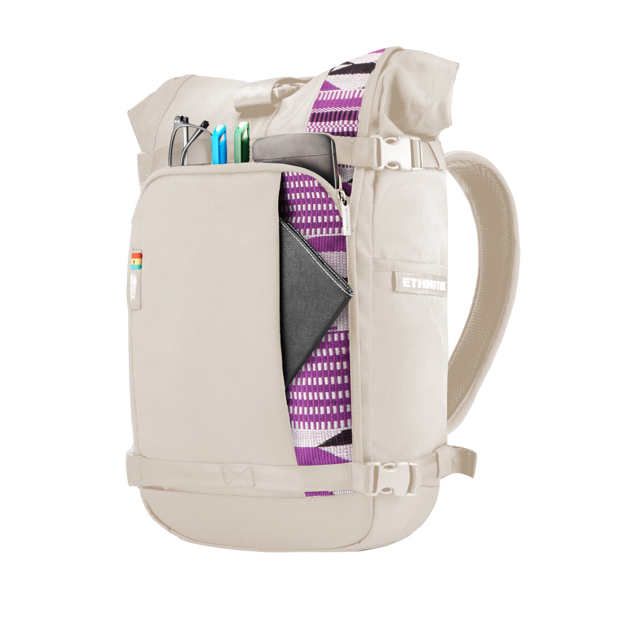 "Raja" ist Hindi und bedeutet übersetzt König. Denn die Familie der Raja Rucksäcke bildet die Königsklasse der Ethnotek Produkte. Das Besondere an den Raja Rucksäcken sind die austauschbaren Muster, "Threads" genannt. Mit den Threads kannst du je nach Outfit oder Stimmung deinen Rucksack verändern. Die Stoffe der Threads werden in Handarbeit hergestellt von Kunsthandwerker*innen aus Ghana, Guatemala, Indien, Indonesien und Vietnam.
