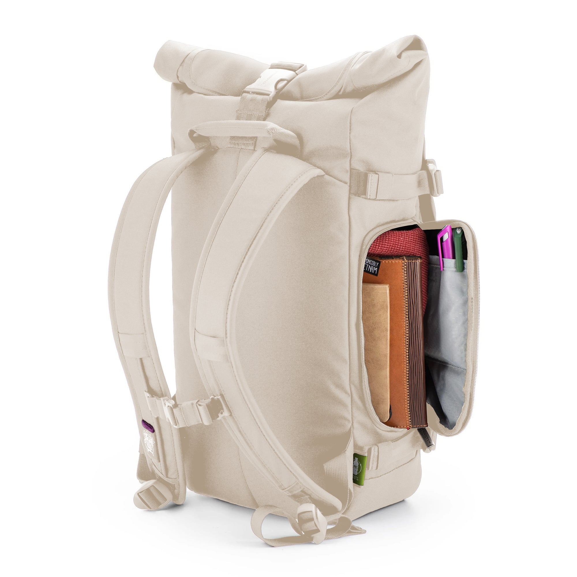 - Großes, wetterfestes Rolltop Hauptfach kann bis 30 Liter ausgerollt werden. Eingerollt wie auf dem Foto sind es 27 Liter