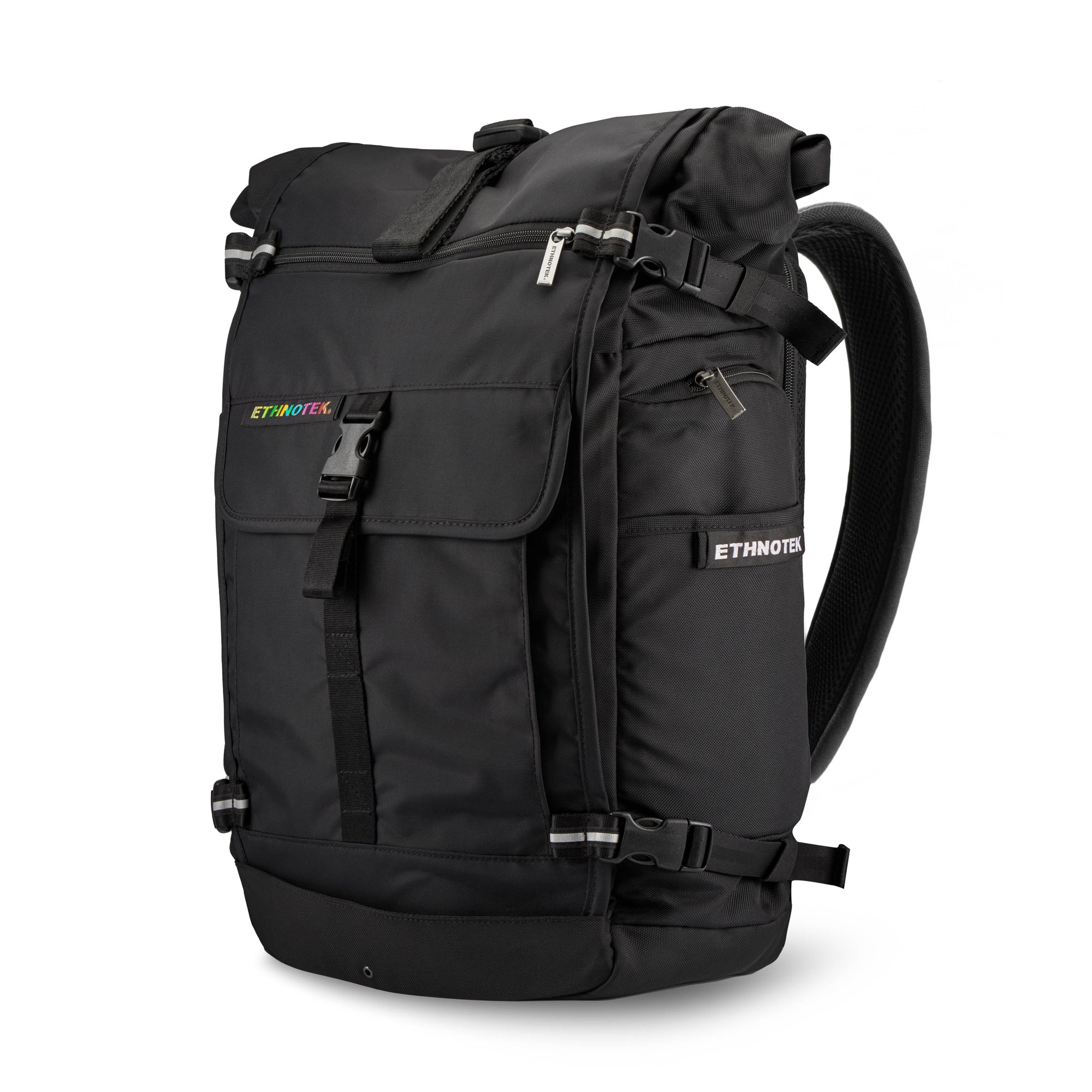 - 4 Schnellverschlüsse zum befestigen des Austauschbaren Musters und Gegenständen wie Yogamatten, Zeltstangen, Stative oder kleine Skateboards vertikal an der Seite der Tasche.